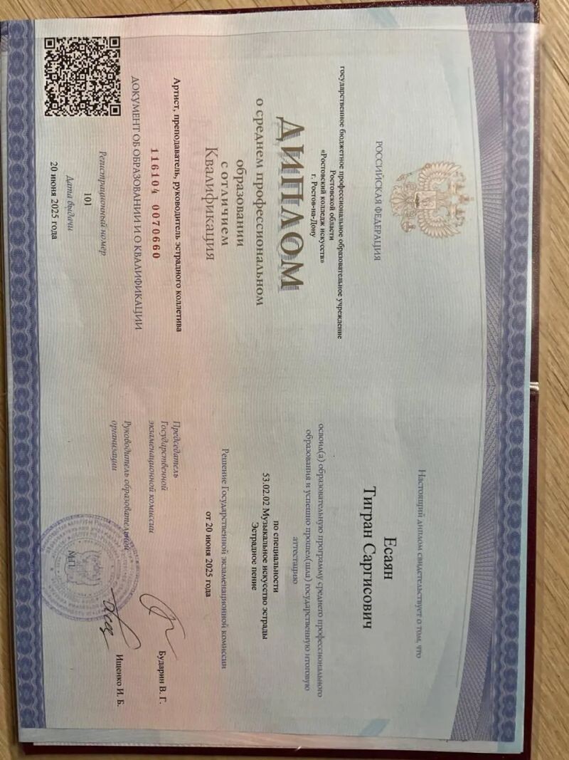 - «Ростовский колледж искусств» - Эстрадное пение Артист, преподаватель, руководитель эстрадного коллектива, 2021–2025 гг.