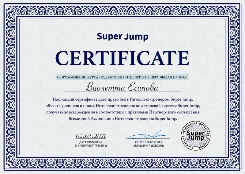 - Super jamp, сертификат интеллект-тренера, 2021 г.