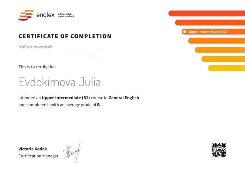 - Englex, Upper-Intervediate (B2), оценка B, 2020 г.