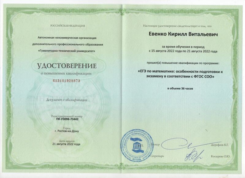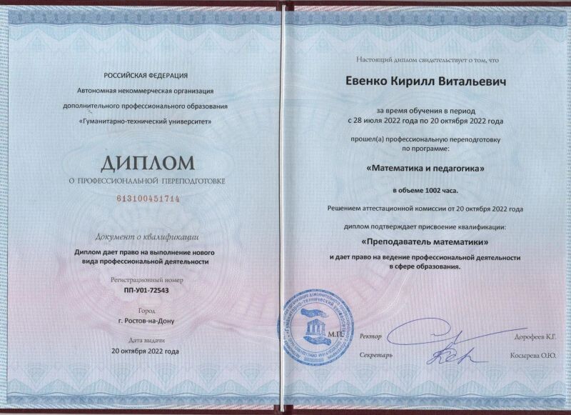 - Гуманитарно-технический университет, математика и педагогика, преподаватель математики, 2022 г.