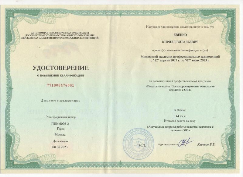 - Московская академия профессиональных компетенций, педагог-психолог, психокоррекционные технологии для детей с ОВЗ, 2023 г.