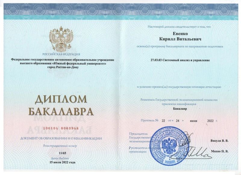 - Южный федеральный университет, системный анализ и управление, 2018–2022 гг.