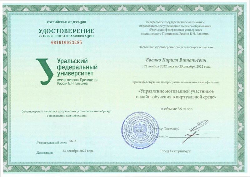 - Уральский федеральный университет, управление мотивацией участников онлайн-обучения в виртуальной среде, 2022 г.