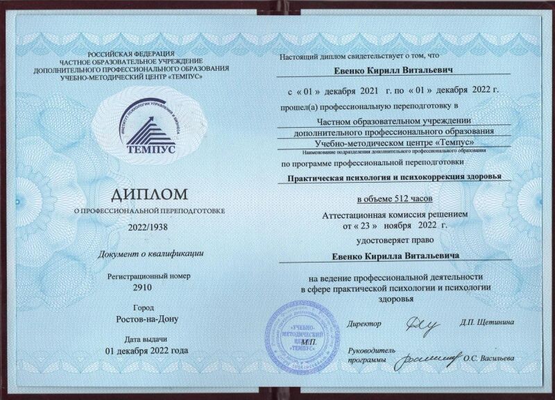 - Институт психологии управления и бизнеса, практическая психология и психокоррекция здоровья, 2021–2022 гг.