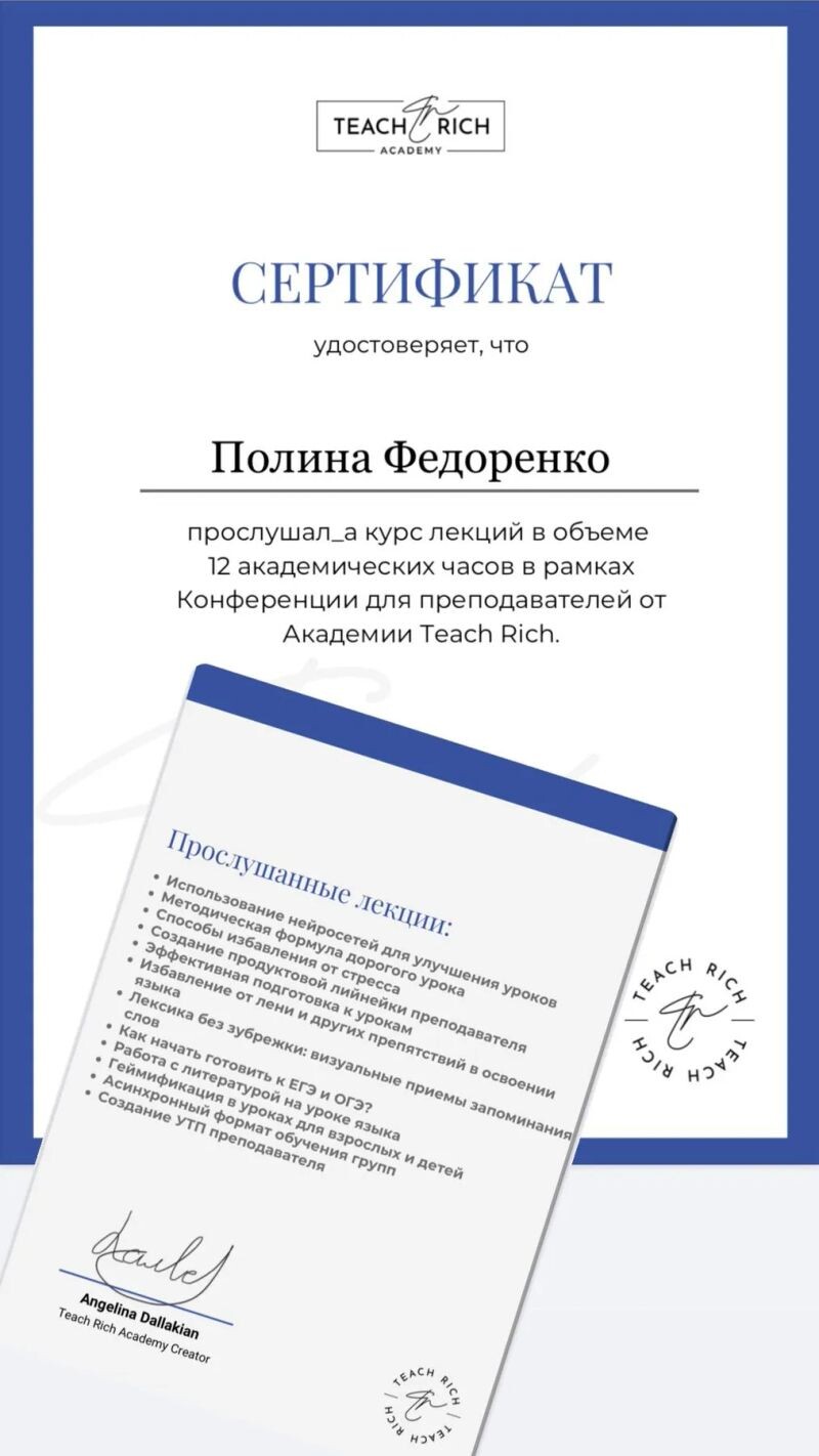 ► Федоренко Полина Максимовна проводит занятия территориально: Таганрог, осуществляет выезд: Таганрог, а также дистанционно в онлайн-формате.