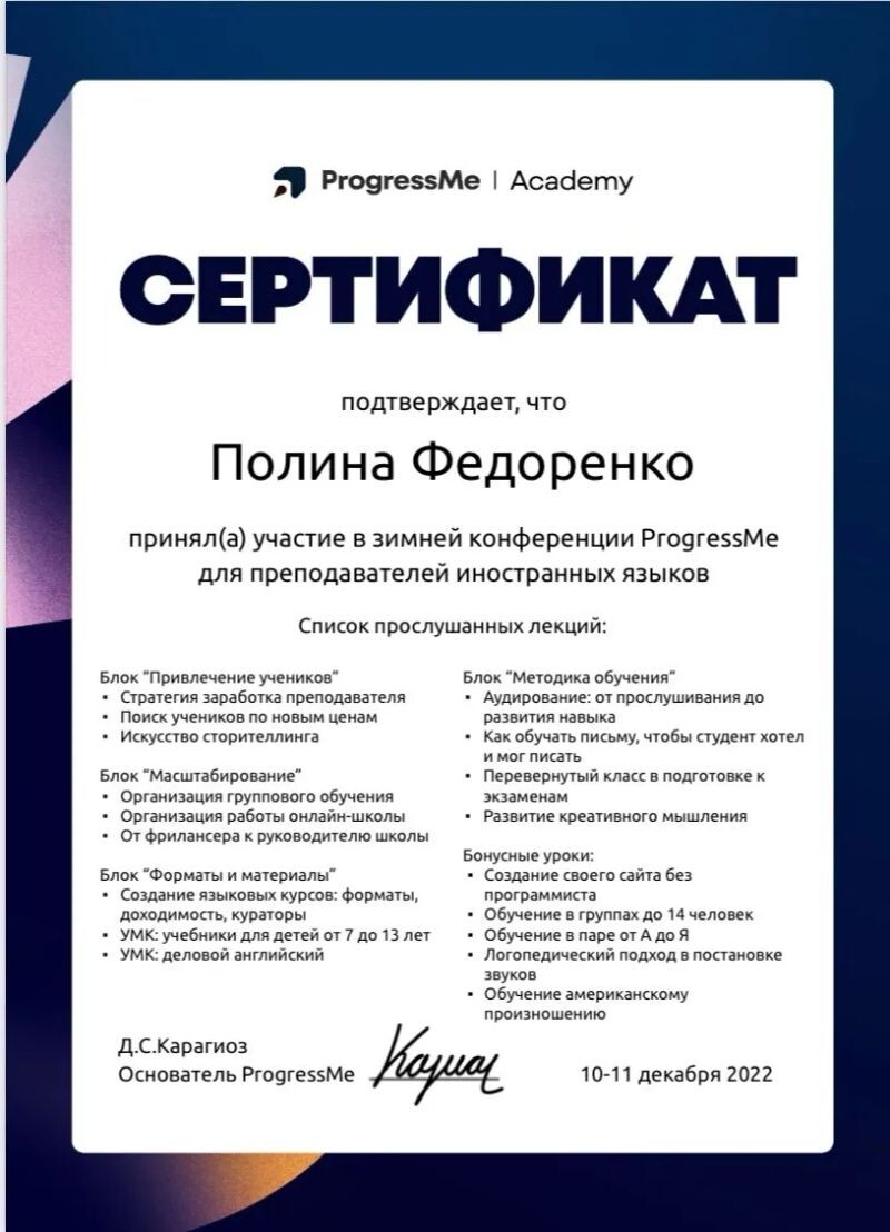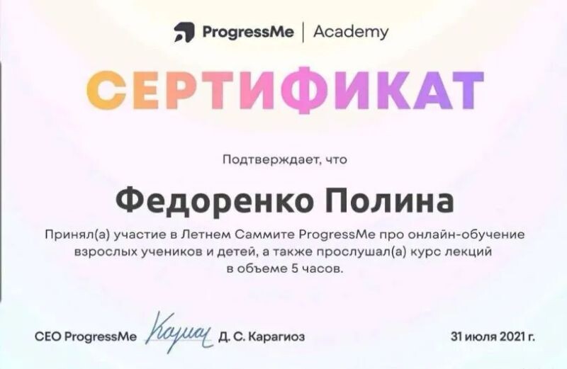 - Участие в летнем саммите от академии Progress me (с 2021 г.).