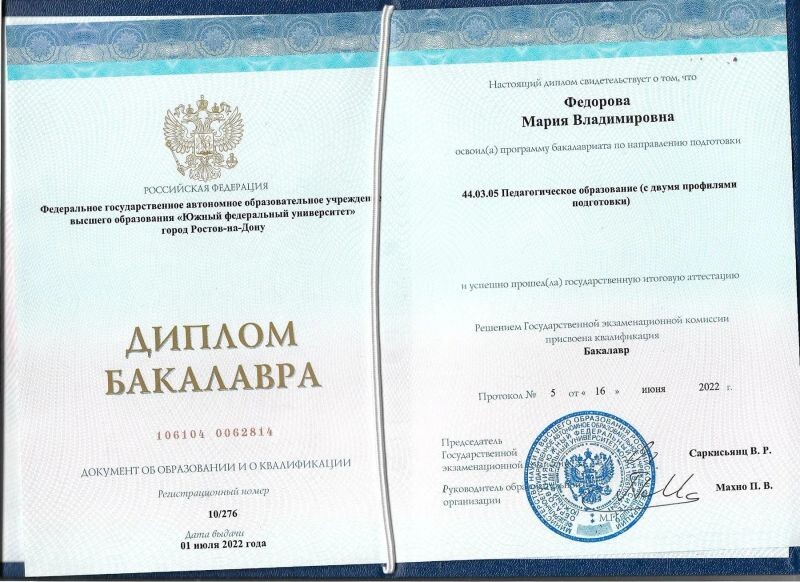 - Южный федеральный университет, педагогическое образование (с двумя профилями подготовки), 2017–2022 гг.