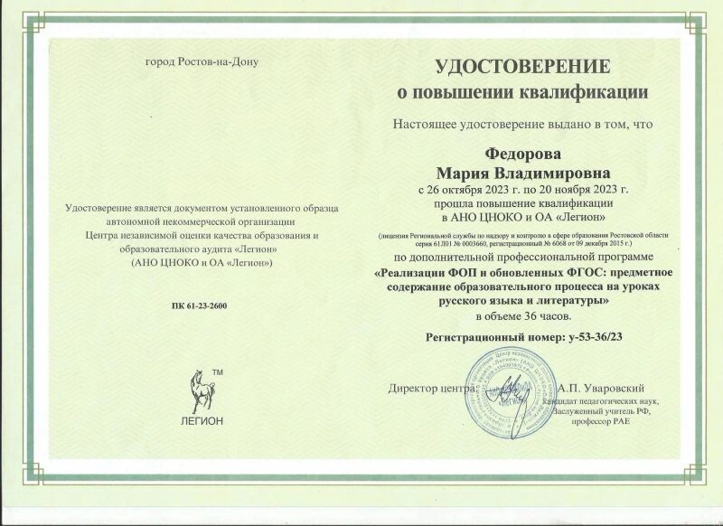 - АНО ЦНОКО и ОА «Легион», повышение квалификации по программе «Реализации ФОП и обновленных ФГОС: предметное содержание образовательного процесса на уроках русского языка и литературы», 2023 г.
