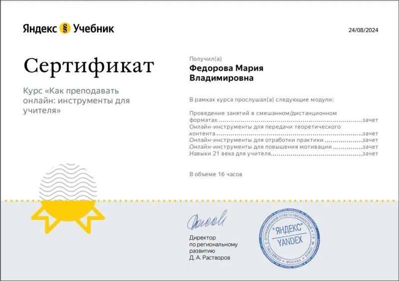 - Яндекс.Учебник, курс «Как преподавать онлайн: инструменты для учителя», 2024 г.
