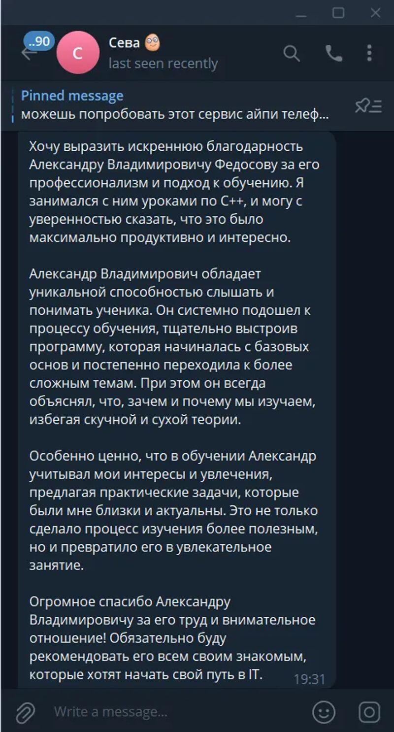 Очень понравился репетитор, понятно преподносит материал и разъясняет трудные моменты, также легко подстраивает занятия под конкретные цели и при желании дает дополнительные ресурсы для изучения нужного материала