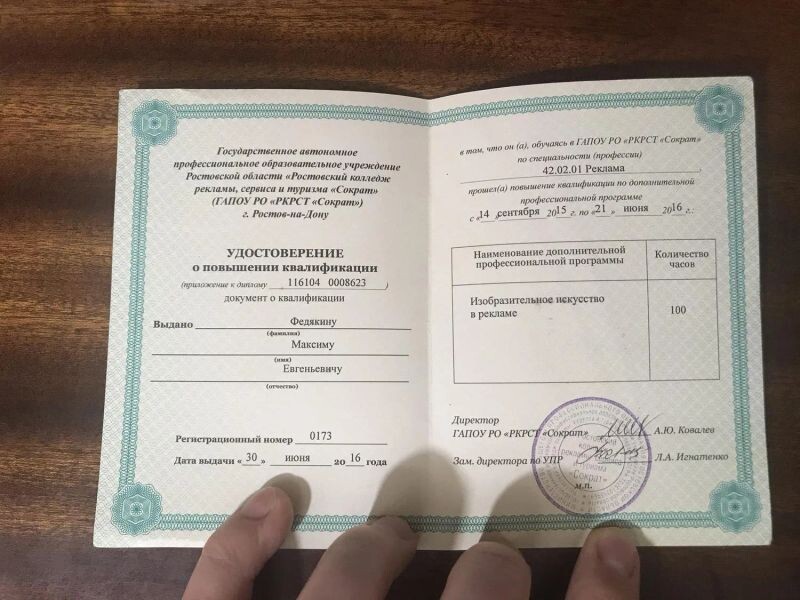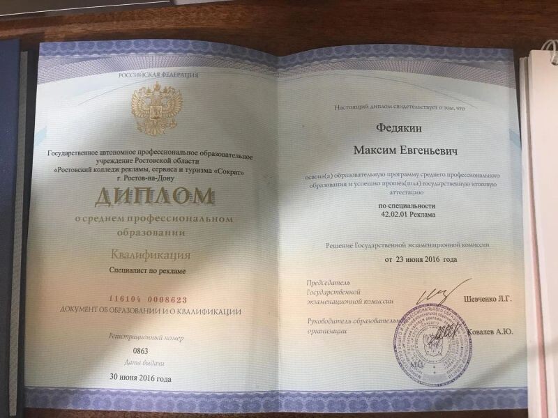 - Ростовский колледж рекламы, сервиса и туризма «Сократ», реклама, 2012–2016 гг.