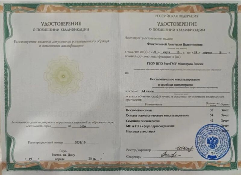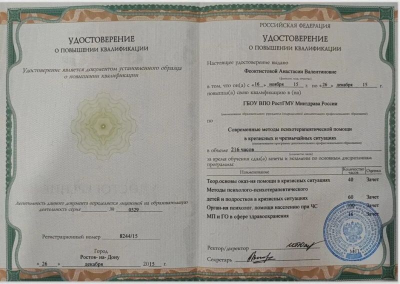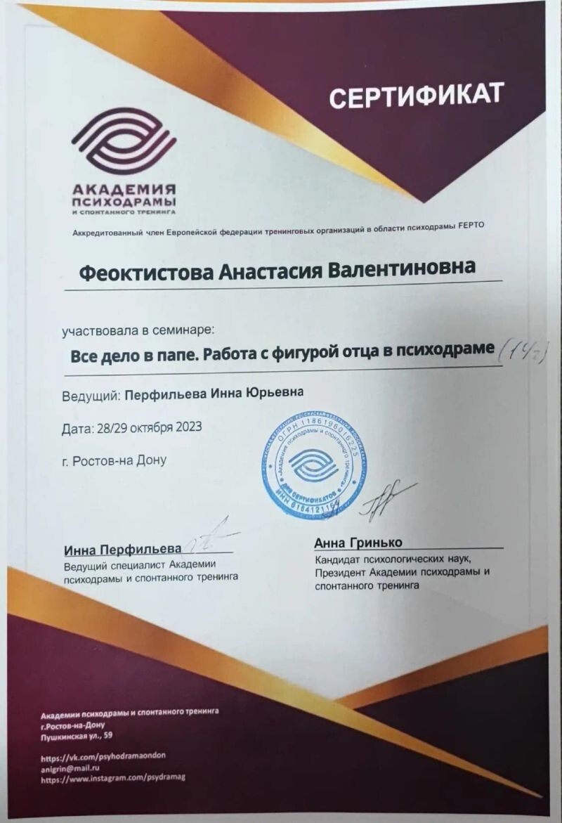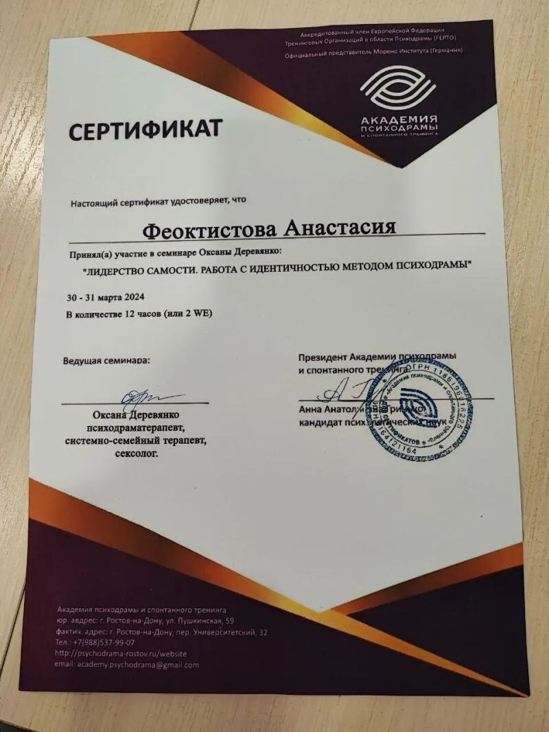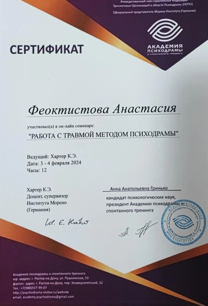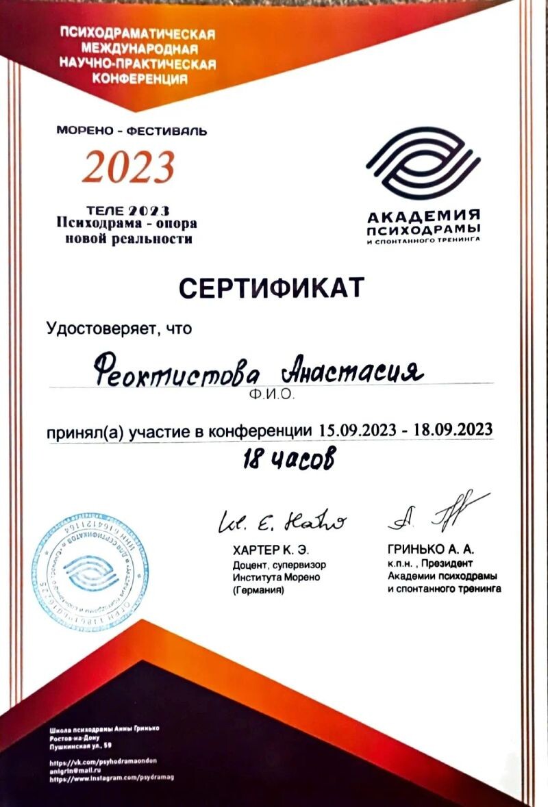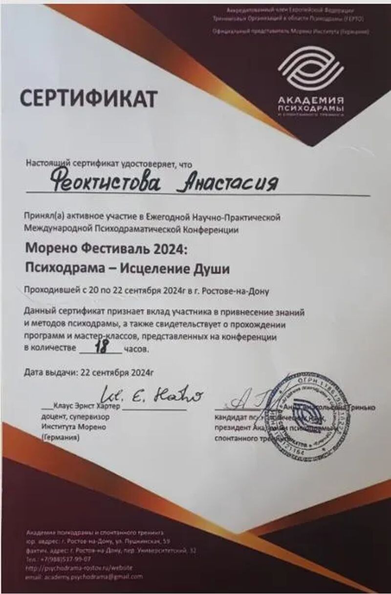 - Академия психодрамы и спонтанного тренинга г.Ростов-на-Дону, Психодрама, 70 часов, 2023–2024 гг.