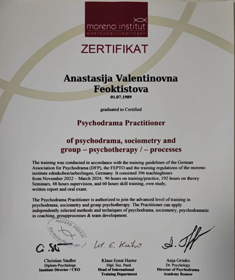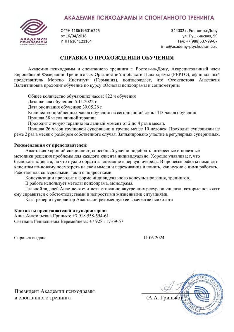 - Академия психодрамы и спонтанного тренинга г.Ростов-на-Дону3, Психодрама, 413 часов (с 2022 г.).