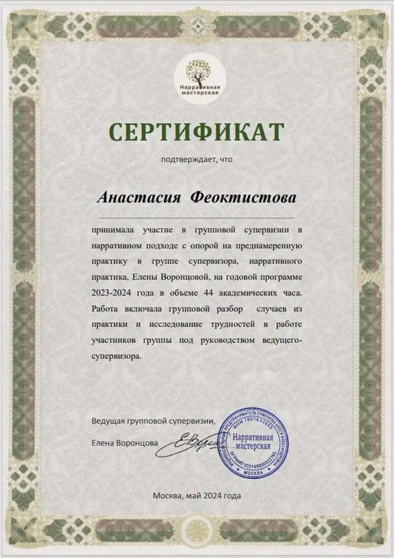- Нарративная мастерская, групповая супервизия с Еленой Воронцовой в нарративном подходе с опорой на преднамеренную практику, 44 ак. ч, 2023–2024 гг.