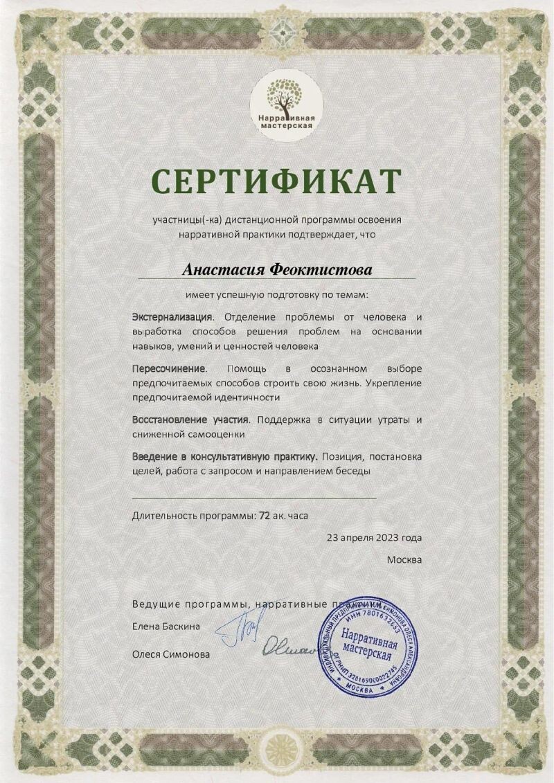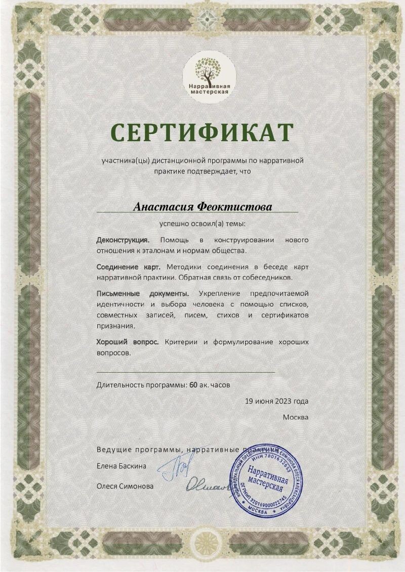 - Нарративная мастерская, освоение нарративной практики: экстернализация, пересочинение, восстановление участия, введение в консультативную практику, 2023 г.