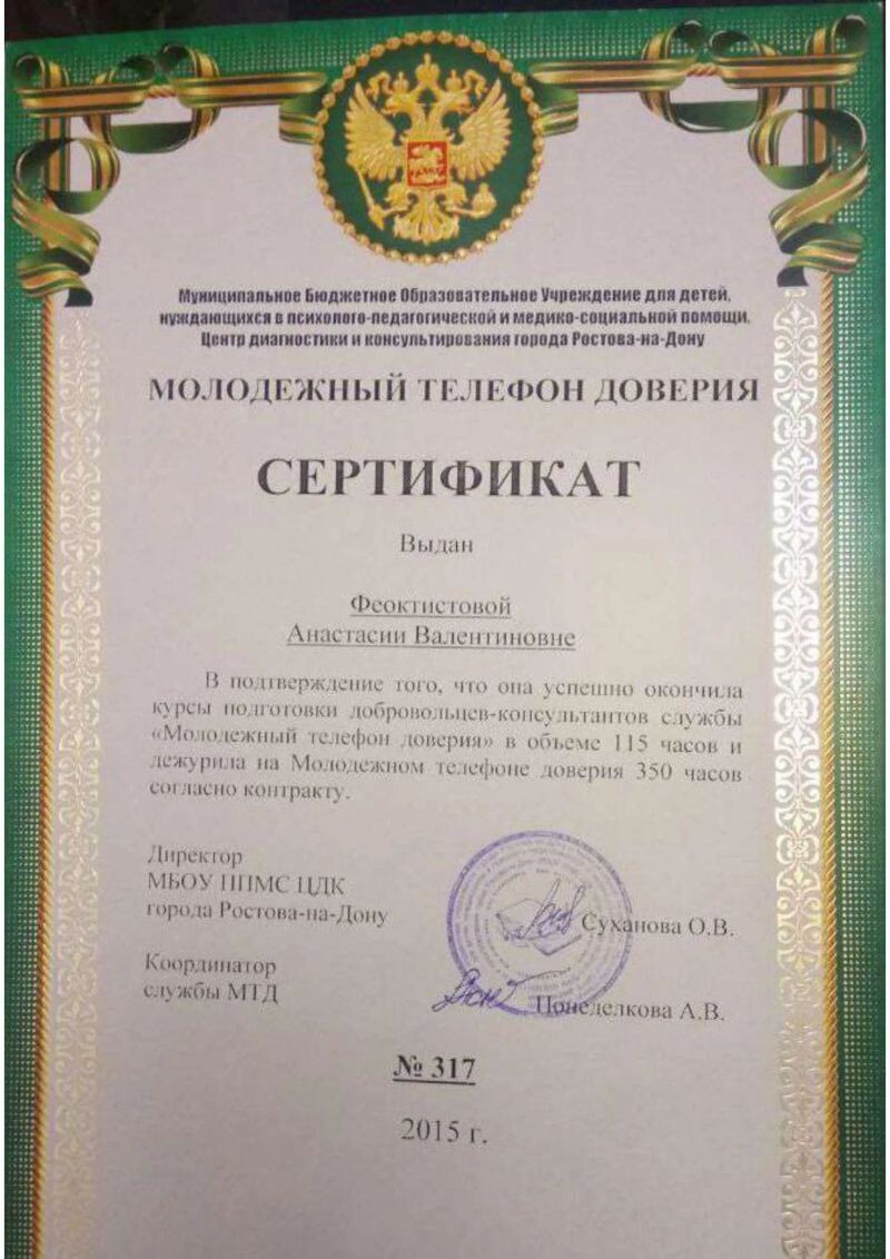 - Консультант на кризисной линии Телефона Доверия. Кризисное консультирование, 2014–2017 гг.