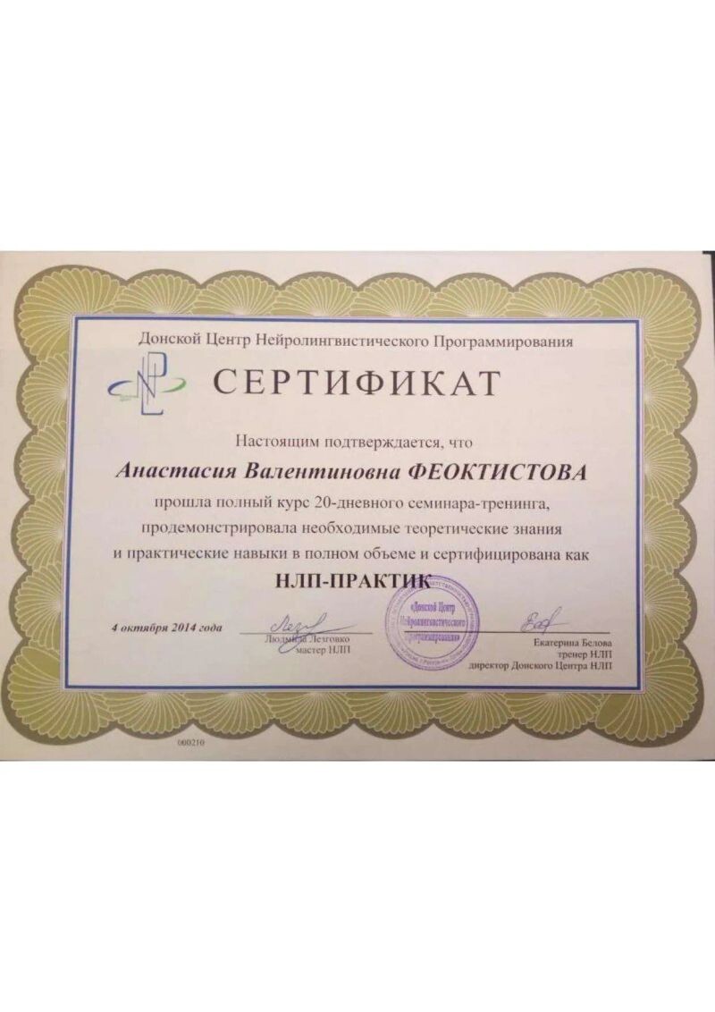 - Донской Центр Нейролингвистического Программирования, Другое, 120 часов, 2013–2014 гг.
