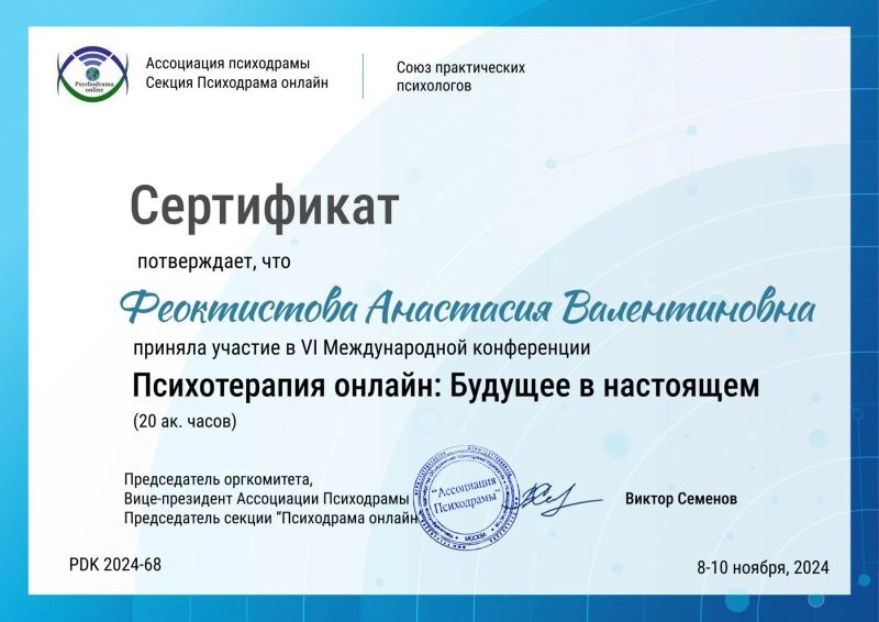 - Ассоциация психодрамы, Союз практических психологов, участие в Vl Международной конференции «Психотерапия онлайн: будущее в настоящем», 2024 г.