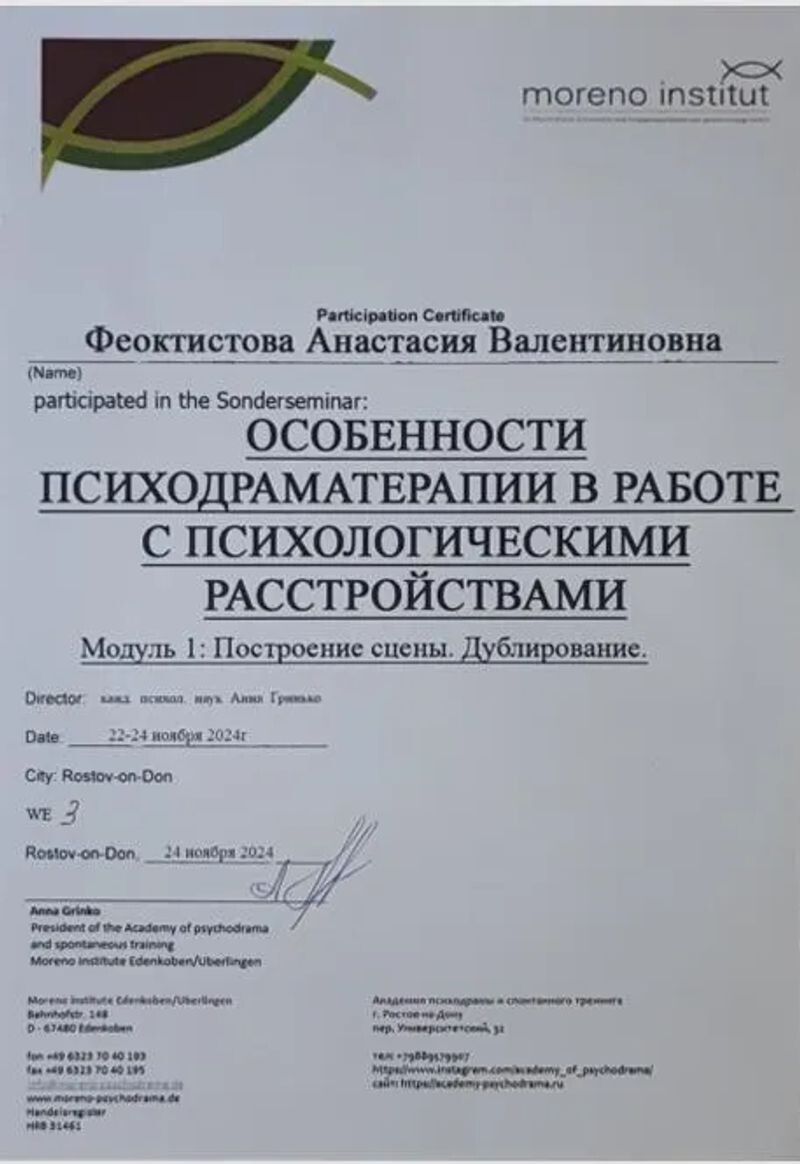 - Академия психодрамы и спонтанного тренинга, семинар «Особенности психодраматерапии в работе с психологическими расстройствами. Модуль 1 „Построение сцены. Дублирование“», 2024 г.