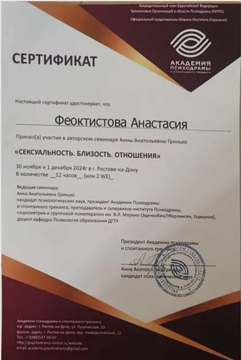 - Академия психодрамы и спонтанного тренинга, авторский семинар Гринько А.А. «Сексуальность. Близость. Отношения», 2024 г.