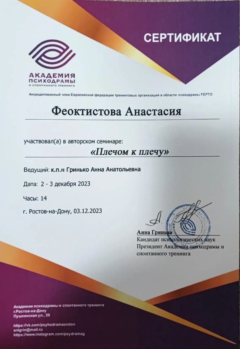 - Академия психодрамы и спонтанного тренинга, авторский семинар Гринько А.А. «Плечом к плечу», 2023 г.