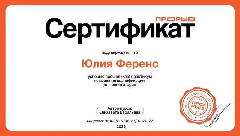 ► Связаться с Ференс Юлией Сергеевной можно за пару минут. Нажмите на кнопку «Связаться с репетитором» и заполните короткую форму.