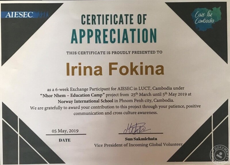 - Преподаватель английского языка от Norway School Interntional в Камбодже в качестве волонтера Incoming Global Volunteer, 2019 г.