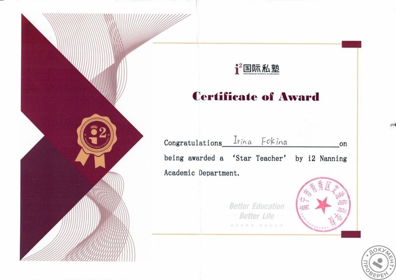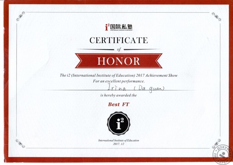 - Сертификат лучшего учителя кампуса Da guan, школа International Institute of Education I2 (г. Наньнин, Китай), 2017 г.