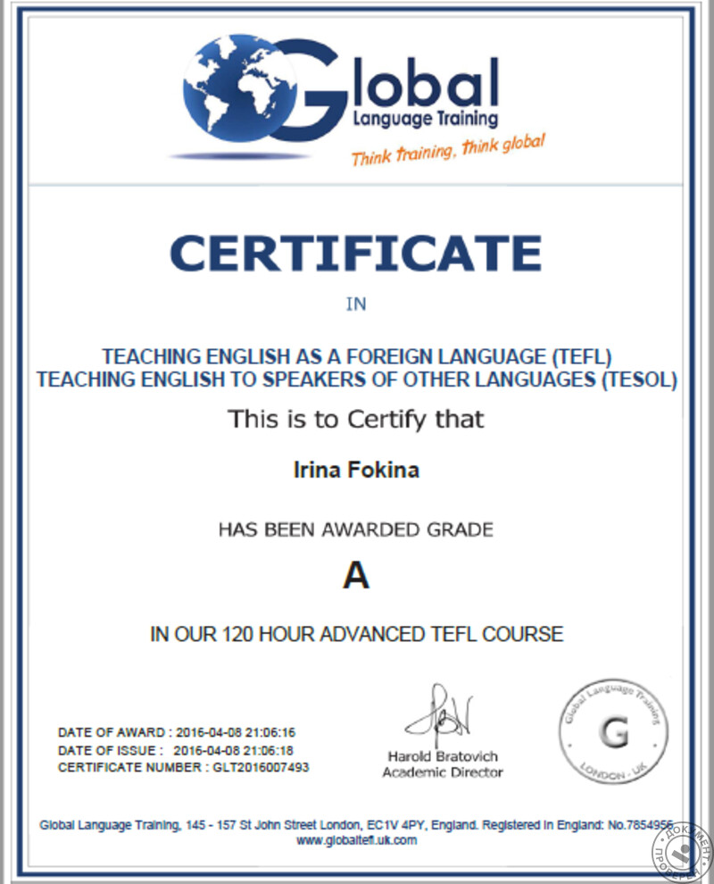 - Сертификат о завершении курса TEFL и сдаче выпускного экзамена на «отлично» в школе Global Language Training, 2016 г.
