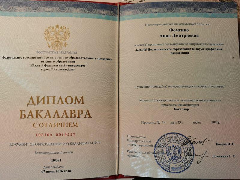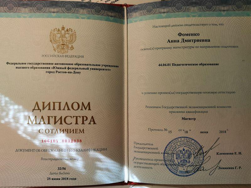 - Южный федеральный университет, педагогическое образование с двумя профилями — русский язык и литература, магистр, 2016–2018 гг.