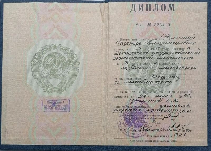 - Таганрогский государственный педагогический институт, учитель физики и математики, 1985–1990 гг.
