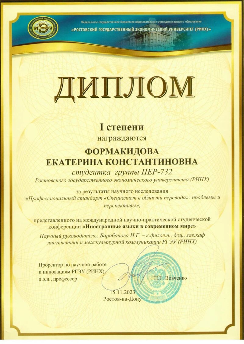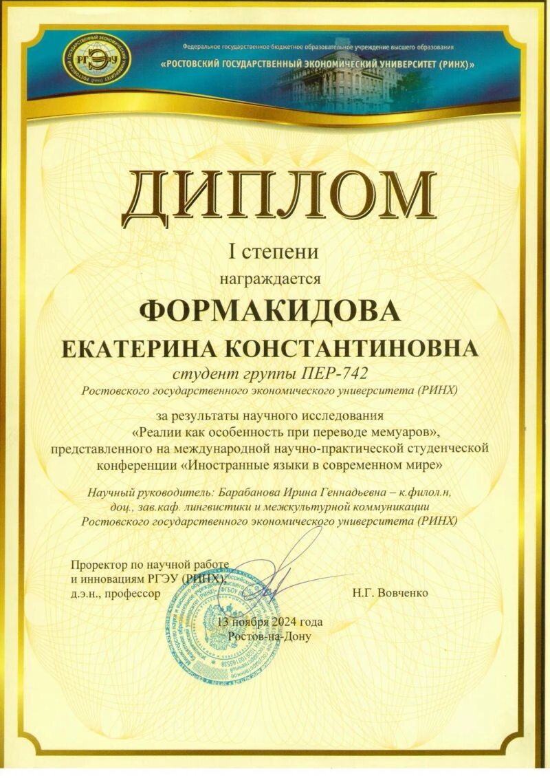 - Международная научно-практическая студенческая конференция "Иностранные языки в современном мире", диплом 1 степени (с 2023 г.).