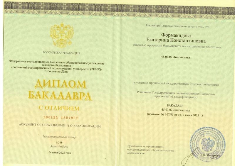 - Ростовский государственный экономический университет (РИНХ), факультет лингвистики и журналистики, кафедра лингвистики и межкультурной коммуникации, диплом бакалавра в области лингвистики, переводчик с английского и немецкого языков, 2021–2025 гг.