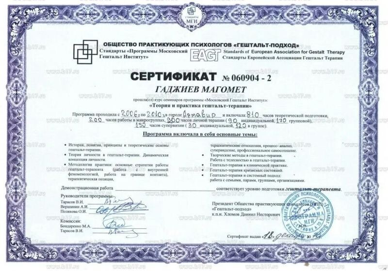- Московский гештальт институт, 1-2 ступень, 2006–2010 гг.
