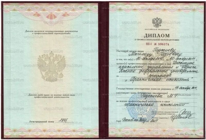 - Южный федеральный университет, институт психологии, управления и бизнеса, практическая психология, 2010–2011 гг.