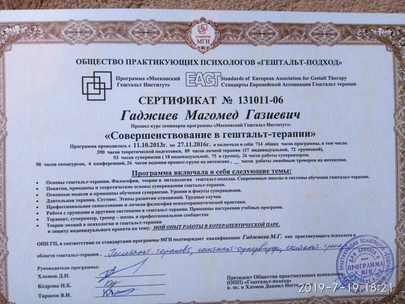 - Московский гештальт институт, 3 ступень, 2013–2016 гг.