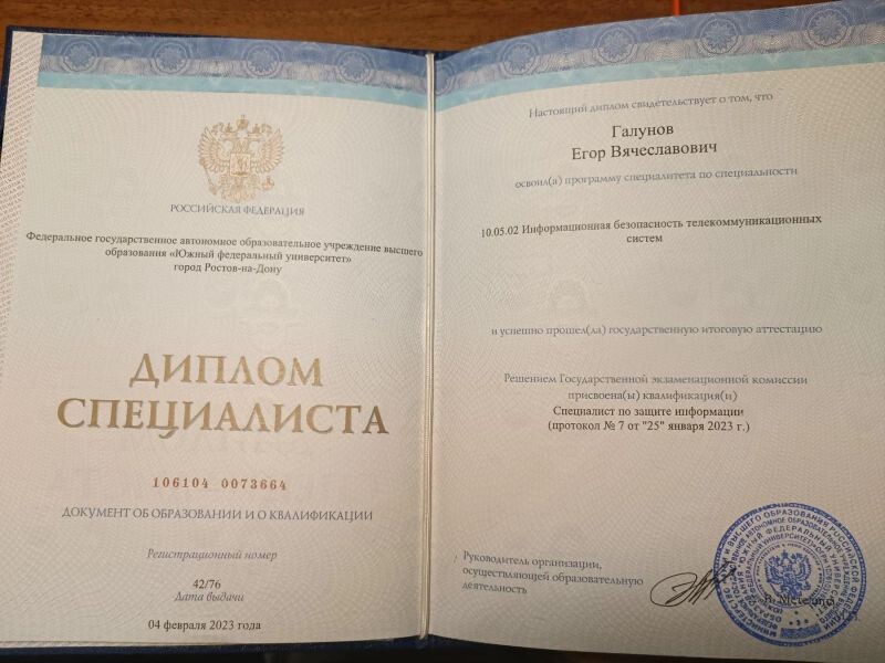 - Инженерно-технологическая академия ЮФУ, информационная безопасность телекоммуникационных систем, специалист по защите информации, 2017–2023 гг.