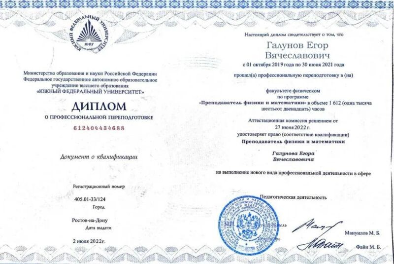 - Южный федеральный университет, профессиональная переподготовка по программе «Преподаватель физики и математики», 2019–2022 гг.