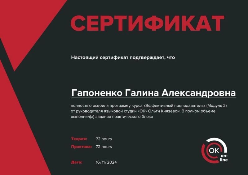 - Языковая студия «ОК», курс «Эффективный преподаватель», модуль 2, 2024 г.