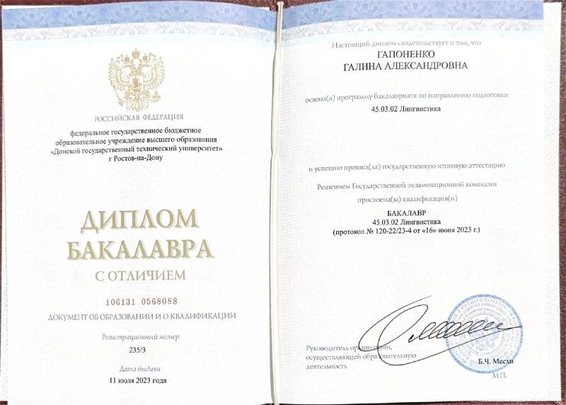 - Донской государственный технический университет, г. Ростов-на-Дону, лингвистика, бакалавр, 2019–2023 гг.