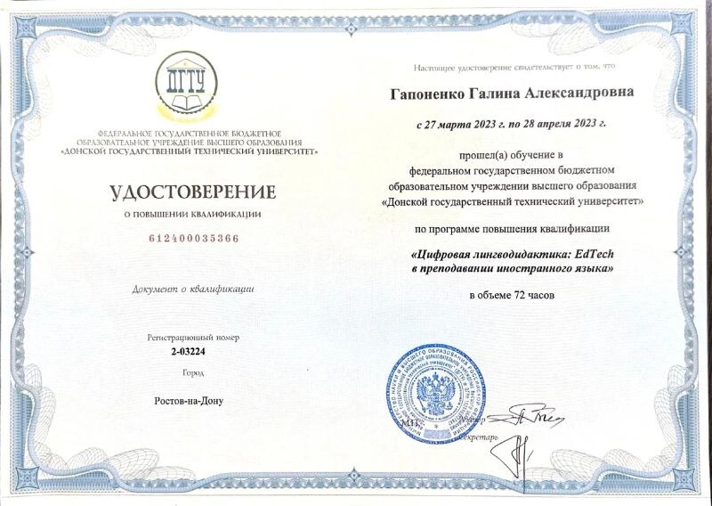 - Донской государственный технический университет, программа «Цифровая лингводидактика: EdTech в преподавании иностранного языка», 2023 г.