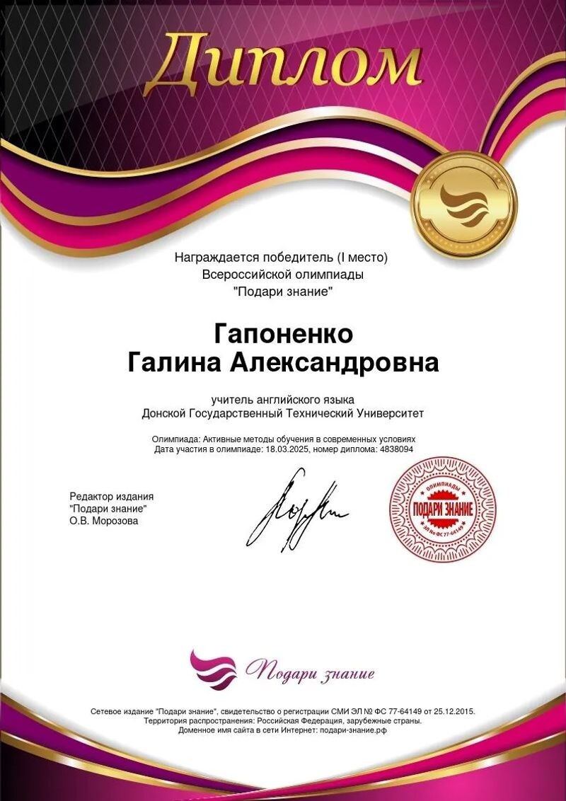 - Всероссийская олимпиада «Подари знание», олимпиада «Активные методы обучения в современных условиях», 1 место, 2025 г.