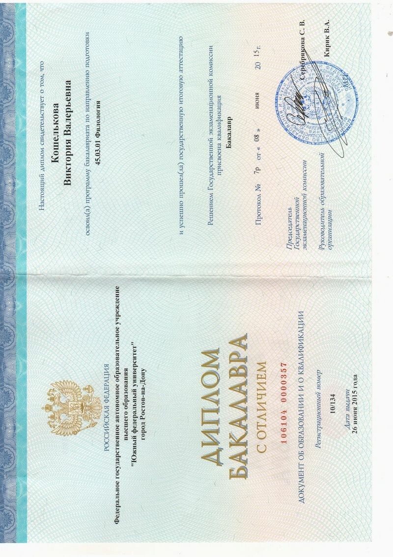 - Южный федеральный университет, факультет филологии, журналистики и межкультурной коммуникации, бакалавриат, специальность – зарубежная филология (английский язык и литература), 2011–2015 гг.