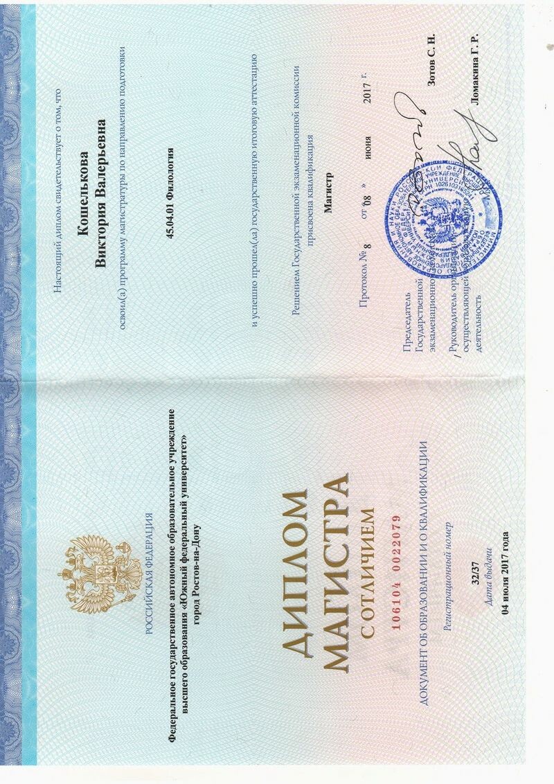 - Южный федеральный университет, институт филологии, журналистики и межкультурной коммуникации, магистратура, специальность —филология, 2015–2017 гг.