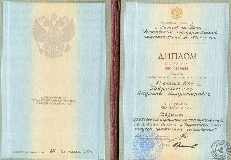 - Ростовский государственный педагогический университет, дошкольный факультет, специальность "Педагогика и методика дошкольного образования",2001 год окончания.