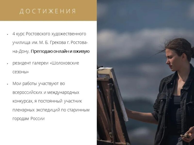 - Частная художественная школа по подготовке абитуриентов к поступлению в вузы, сузы Педагогическая практика в ДХШ 35 / ДАХШ при ЮФУ (педагог ИЗО) — 1 год.