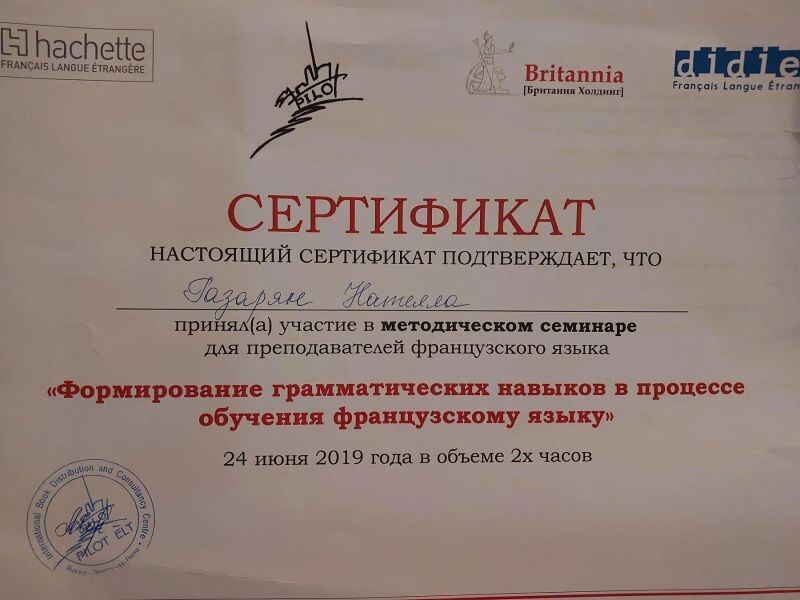 - Методический семинар «Формирование грамматических навыков в процессе обучения французскому языку», 2019 г.