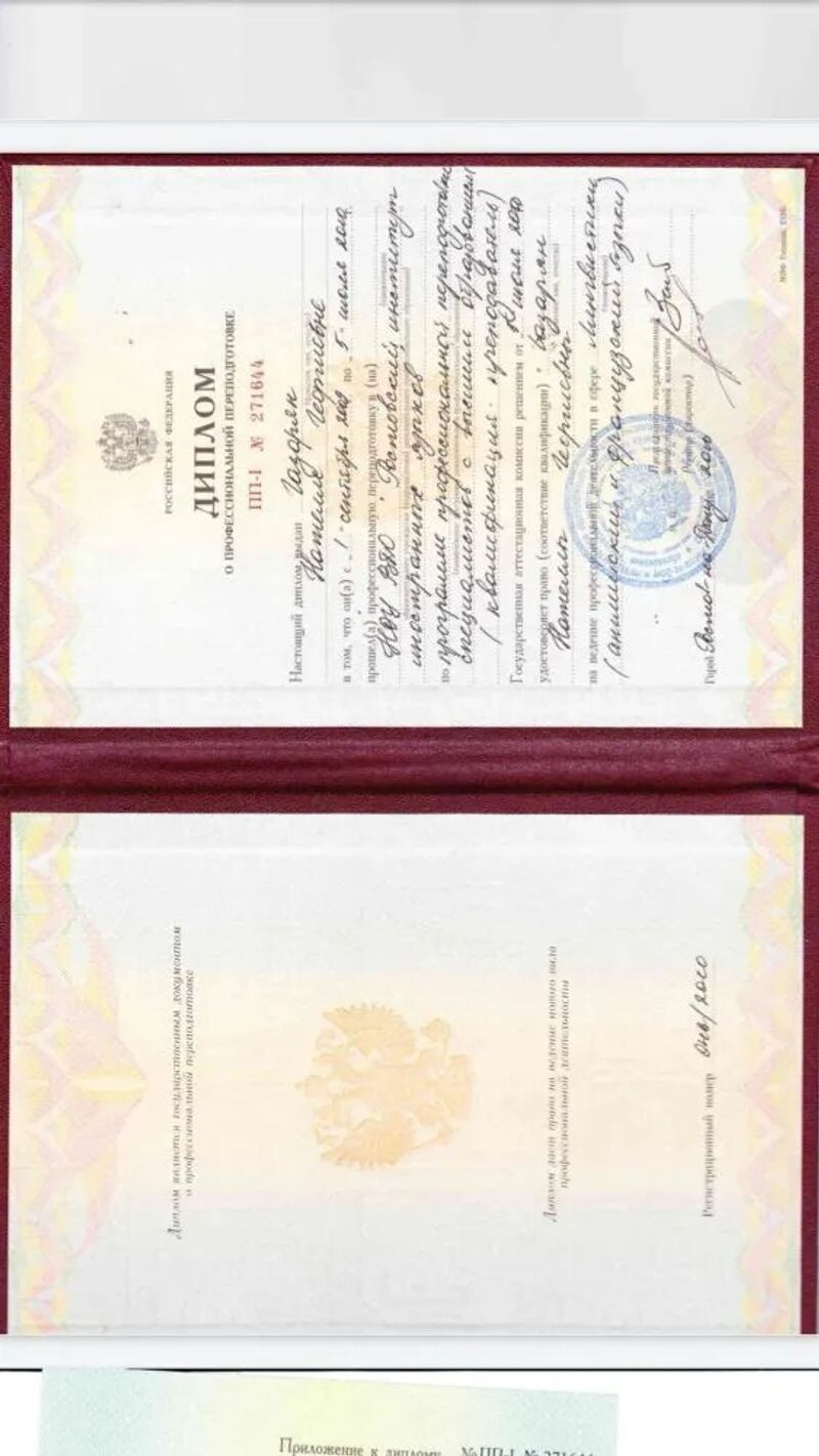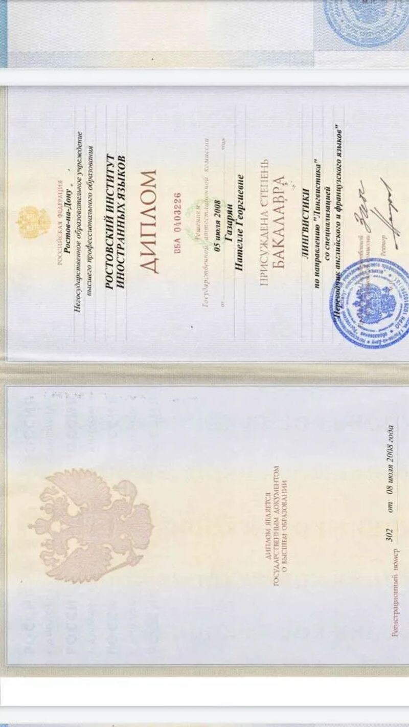- Ростовский институт иностранных языков, бакалавр лингвистики, квалификация – переводчик английского и французского языков, 2003–2008 гг.