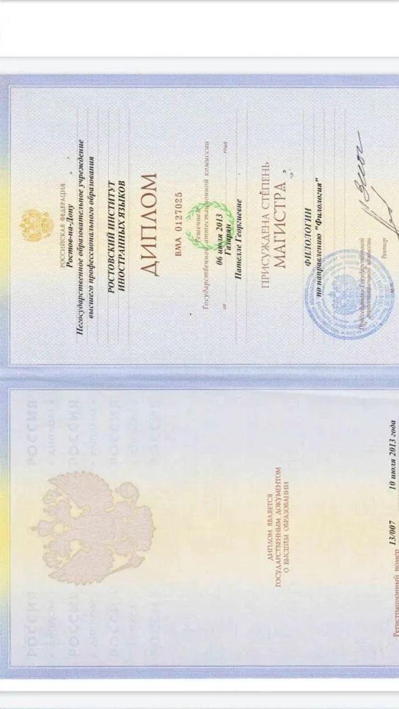 - Ростовский институт иностранных языков, магистр филологии, 2008–2013 гг.