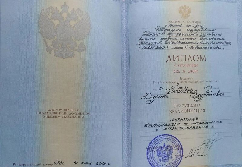 - ФГБОУ ВПО «Ростовская государственная консерватория (академия) им. С.В. Рахманинова», музыковедение, музыковед, преподаватель, 2008–2013 гг.